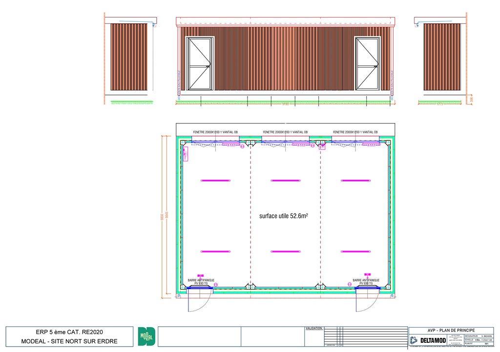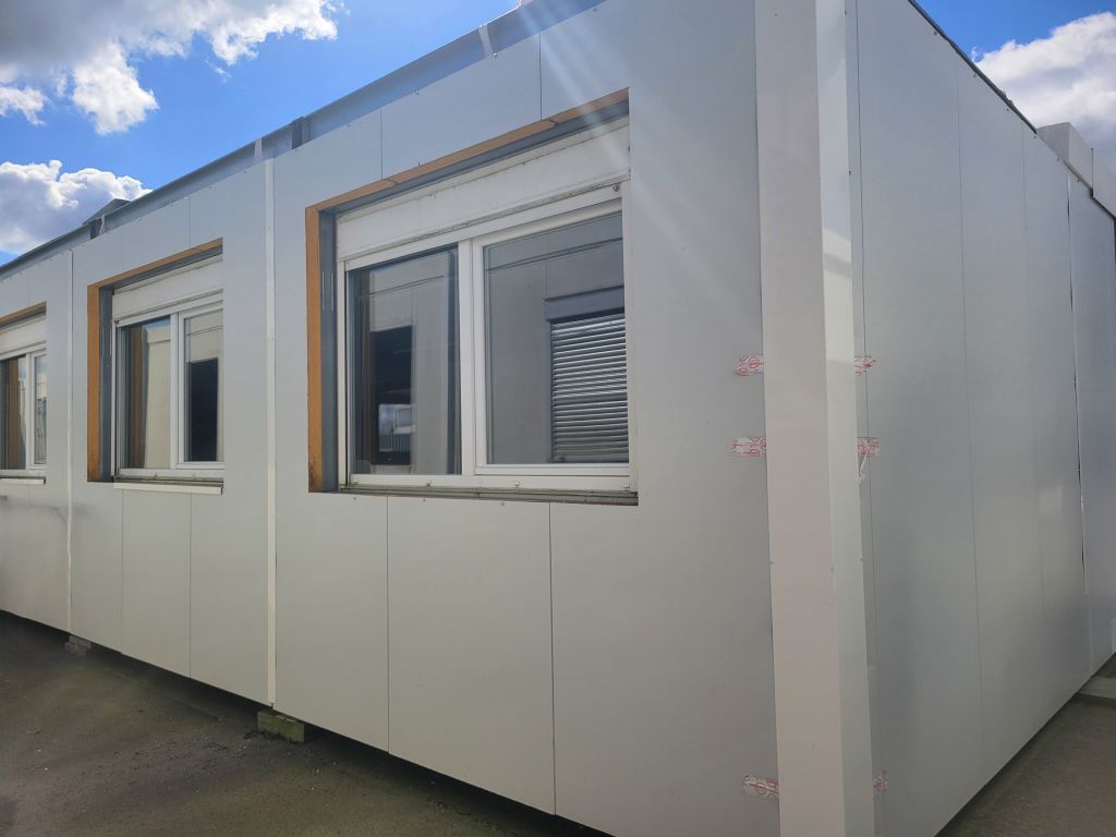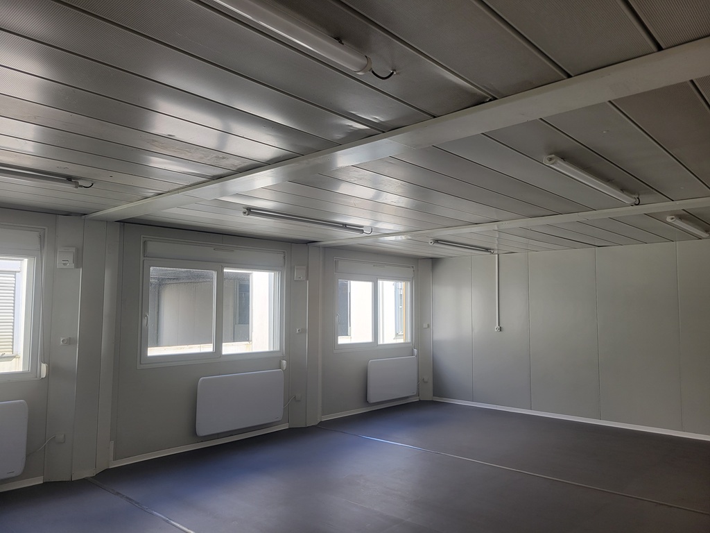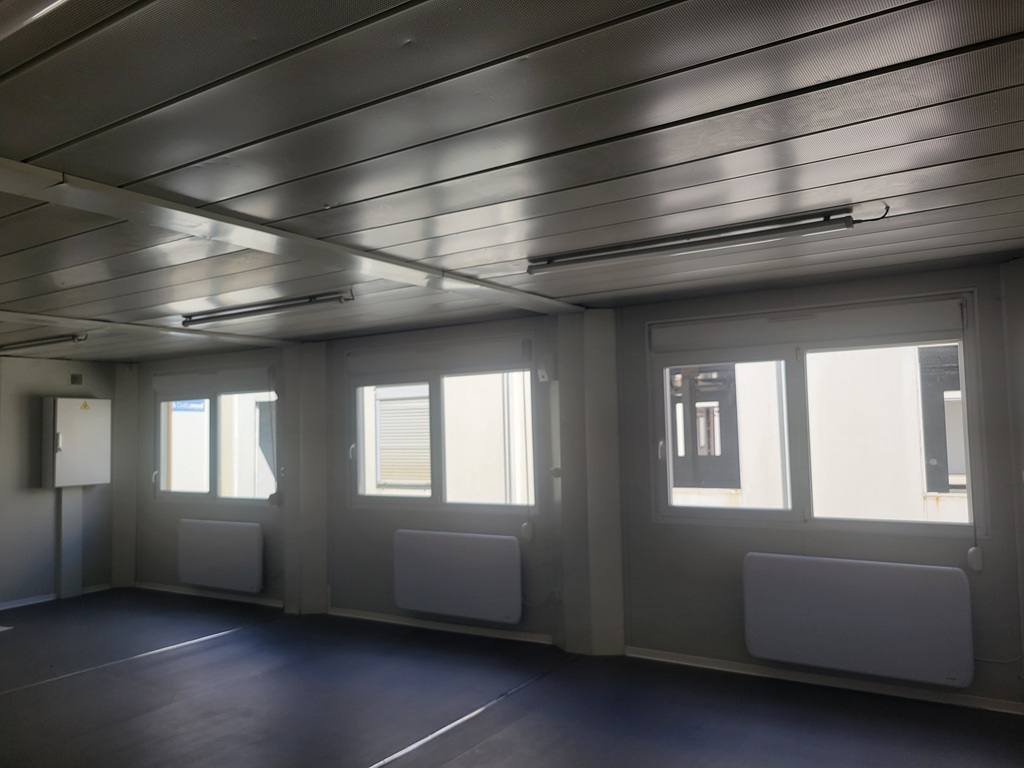Modulaire ensemble RE2020, aux normes ERP, se compose de 55m² équipé de 2 portes de 0,90m et 3 fenêtres de 2,00 x 1,20m en double vitrage et volet roulant.